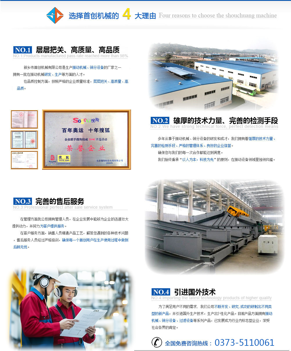 新鄉市首創機械有限公司是生產振動機械、篩分設備的廠家,擁有一批在振動機械研發、生產等方面的人才,有著雄厚的技術力量、完善的檢測手段、嚴格的管理體系、良好的企業信譽。